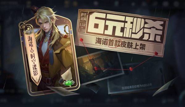 王者荣耀海诺时空谍影皮肤将在1月12日0:00正式登场,前往皮肤商店就可以购买,首周秒杀价格为60点券,同时拥有限时兑换碎片商城活动,兑换价格为48碎片。