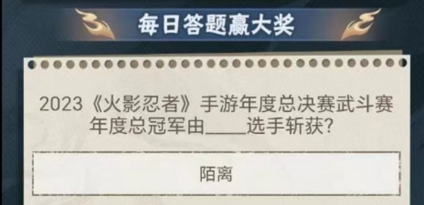 火影忍者1月12日每日一题为2023火影忍者手游年度总决赛武斗赛年度总冠军由_选手斩获,本题答案是陌离,关注火影忍者官方公众号即可参与每日一题答题活动和签到活动。