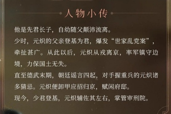 浮生忆玲珑元炽的母亲有可能是先皇后,炽是先帝的长子,属于皇子身份,母亲被害身死后又遭受继后迫害,在少时就被迫远离家乡,前往边境保全自身,是游戏中的的四大守护之一。