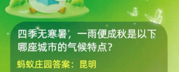 蚂蚁庄园2月2日问题是四季无寒暑,一雨便成秋是以下哪座城市的气候特点,答案是昆明,昆明有春城之称,四季不分明,冬夏温差小,下雨会有凉意。