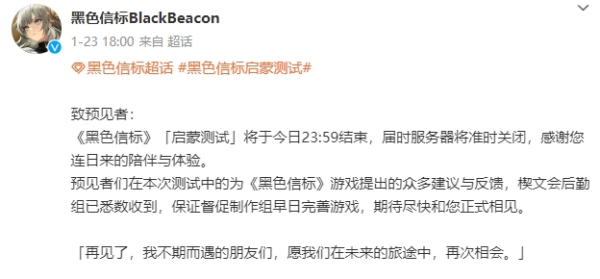 黑色信标目前还没有公布具体的公测时间,上一次内测是1月18日,刚刚结束不久,二次元动作角色扮演类,文明和策略的上演,具有独特视觉的ARPG手游。