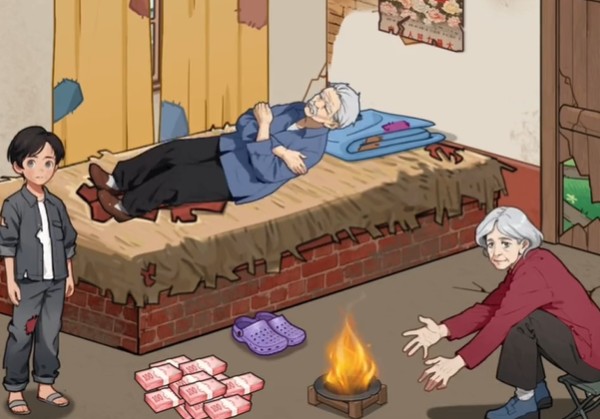 无敌脑洞王者空巢老太这关玩家需要拖动地上的钱到合适的位置,改善老太的生活质量才能通关,首先把钱推给床上发抖的老爷爷,再把钱拖给旁边的小孩、老奶奶、地上的拖鞋、还有旁边的火炉。