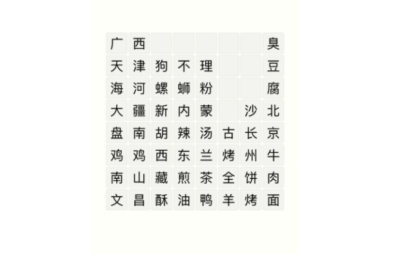 按照顺序将这些城市美食连接起来就能够将全部词语消灭掉,即可通关。