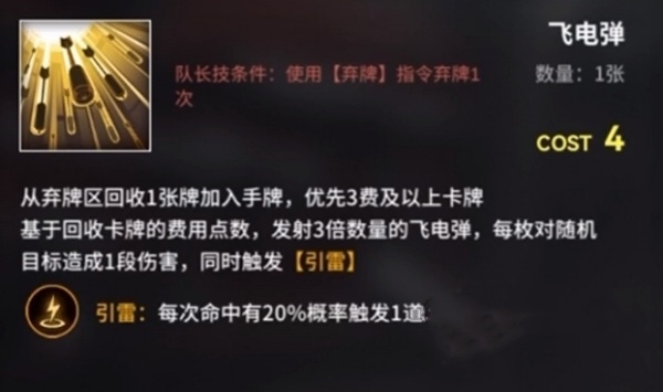 队长技能:从弃牌区回收一张优先3费以上的手牌,根据回收手牌的费用点数,发射三倍于点数的飞电弹。
