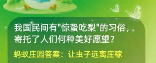 蚂蚁庄园3月5日问题是我国民间有惊蛰吃梨的习俗,寄托了人们何种美好愿望,本题答案是让虫子远离庄稼,谐音是离的意思,寓意远离虫子,让庄稼有好丰收。