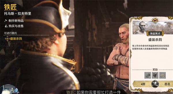 碧海黑帆盛装杀戮玩家需要先找到铁匠进行对话,之后到服饰商人处兑换一次服装,只有高级海盗才能穿上豪华服装,穿上符合海盗身份的服装后再次返回找到铁匠,点击任务选择提交就可以顺利完成。