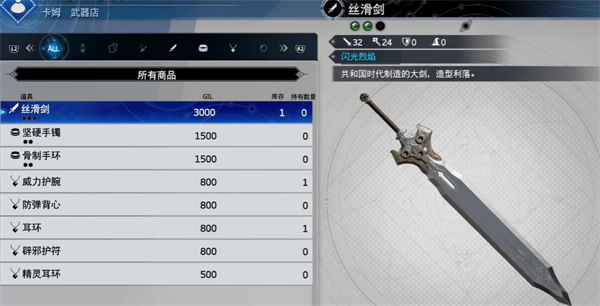 在卡姆市区的武器店里找到丝滑剑花费300GIL进行购买,比较贵不划算,不推荐此方法。