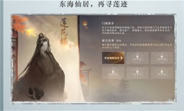 1、门派简介上可以看到进入的条件是收集到6个莲花楼的前程往事消息。