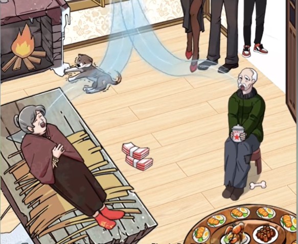 然后再钱分别拖到两位老人身上,地板上、破损的窗户上。