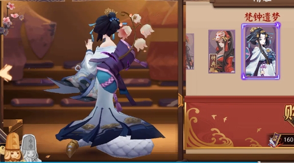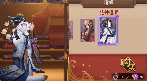 清姬的皮肤梵钟遗梦售价为160皮肤券或者是78魂玉,购买位置在商店中的皮肤屋,点击SR式神可以快速搜索。