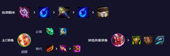 分两种局,风女多的,6级D,就做风女和前排的装备,佐伊和妮蔻直接舍弃掉换加里奥;佐伊多的,改7级D,做佐伊和黛安娜的装备,剩下谁3谁捡破烂。