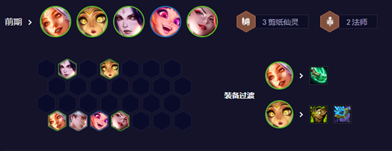 剪纸召唤的凯尔带蓝卷轴站在迦娜旁边加法强,悟空和洛默认1星站第二排。针对高费卡为主C的阵容。一般情况下2-1升4,2-5升5,3-2升6,4-1/4-2升7。前期尽量用强势棋子与羁绊打工,保证打工棋子2星,进而稳定血量健康。尽量使用利息升级,步入7与8阶段,7级、8级替换低费打工卡,向以4-5费棋子为核心阵容转型。