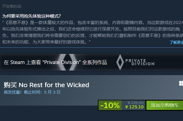 1、游戏目前的首发价格为139,现在至5月3日购买可以享受10%的折扣,价格为125.10。