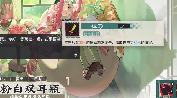 被动拉形,可以在普通攻击后有百分之三十的概率对敌方造成80%的连击伤害。