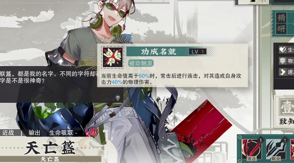 被动功成名就,可以在生命值高于一半的时候,普通攻击造成40%攻击力的连击伤害。