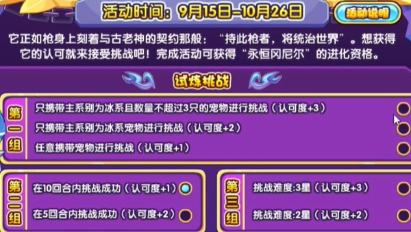 1、活动提供了三组限制的条件、还禁止了冰系宠物进行试炼。
