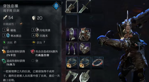 1、穿蚀息壤是一把很长很大的巨剑三级武器,使用双手拿取。