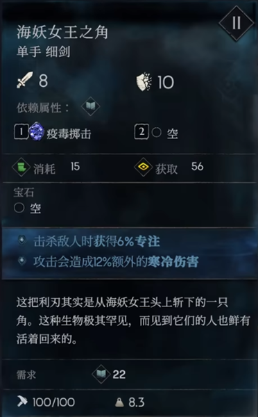 恶意不息游戏中,海妖女王之角是十分强力的武器,该武器虽然为单手的刺剑模板,但是缺具有强力的攻击模组,本期带来该武器的强度具体解析。