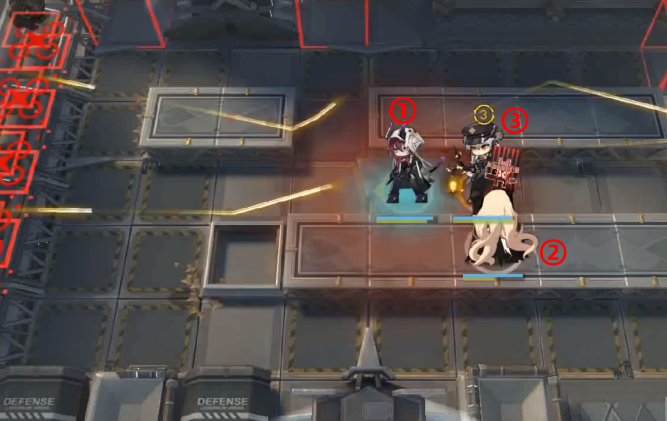 如图所示,开场依次部署阿斯卡纶(朝左)、夜莺(朝上)、塞雷娅(朝左)
