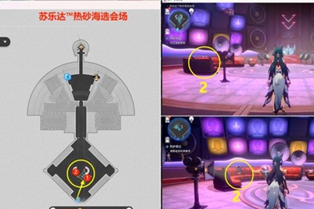 1、请按照指引前往【苏乐达™热砂海选会场】完成下图1与2处的任务对话。