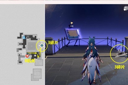 6、当您被传送到上图所在位置时,请调查大钟表后,首先寻找并收集3个碎片。其中,第1个碎片的具体位置如下图所示。