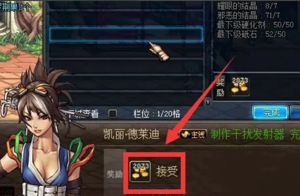 3、她缺少几件制作干扰发射器的零件,告知需要找到镀金手镯*1、耀眼的结晶*7.