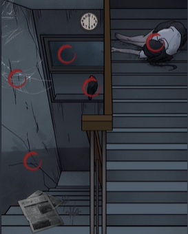 4、最后将顶上的毛巾擦拭玻璃点击玻璃,接着在楼梯处选择墙上的蜘蛛网、倒地的女生。