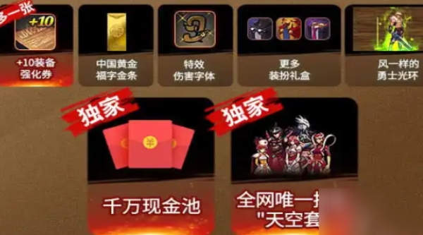 其中包含装备强化券,中国黄金,特效伤害字体,装备礼盒等。