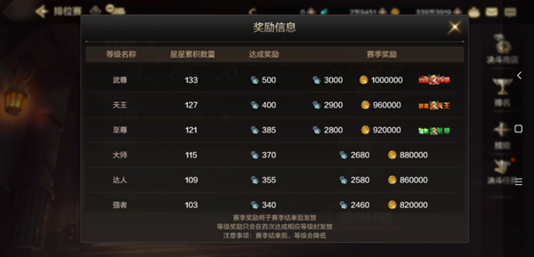 达到相应段位可以获得PVP点数,在赛季结束后,会根据当前的段位发放奖励。