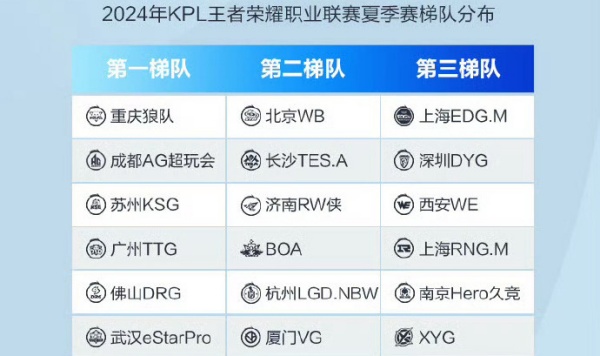 王者荣耀2024夏季赛目前没有确定战队,需要等临时席位赛打完之后现场战队代表上台抽签,春季赛的临时战队是XYG跟BOA打,谁胜则进入第三梯队,在本赛季增加了从K甲获得冠军上莱的九江战队。