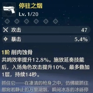鸣潮停驻之烟武器是一把可以给辅助或是副C使用的五星配枪,因为该武器可以提高下一位入场角色的攻击力,除此之外还可以大幅度提高装备角色的共鸣效率。