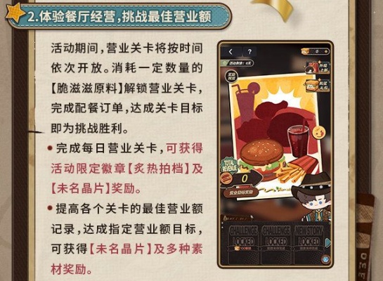 未定事件簿荒野炙味是一种主题玩法,需要玩家经营餐厅并完成营业额度,解锁需要的食材原料制作美食,还有一些配餐订单需要挑战,达成可以获得定制徽章以及其他素材。