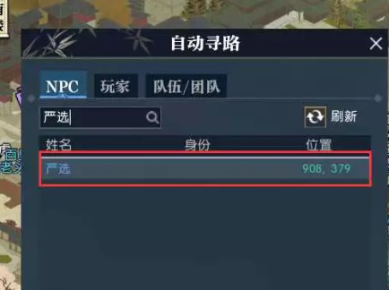2、任务接取之后需要在自动寻路页面输入严选,让根据指引前往汴京的(906,379)坐标处。