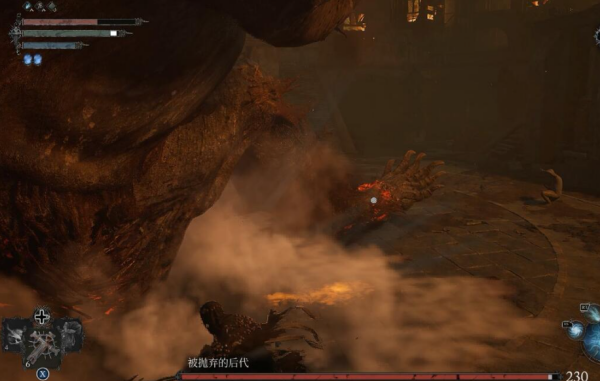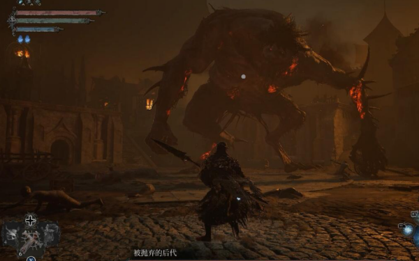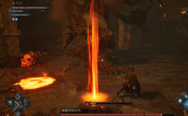 堕落之主被抛弃的后代的第一阶段,玩家靠近攻击时注意boss动作不要迟到身边范围攻击和泰山压顶即可,远离boss时记得保持移动躲脚下的岩浆,进入二阶段后转换到高台进行战斗,当boss的手蓄力后沿着城墙前往别的平台继续战斗。