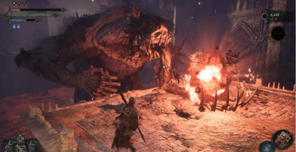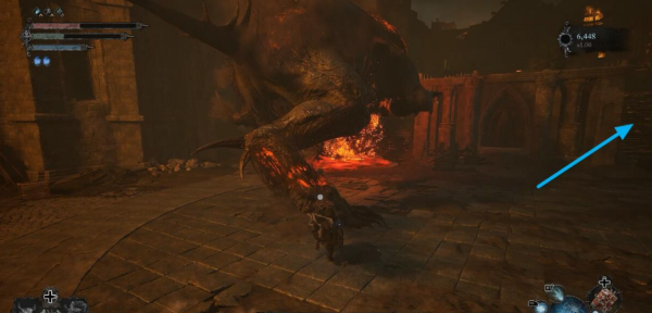 8、boss的手短暂蓄力后会用岩浆覆盖这块平台,玩家要沿着城墙到别的平台继续战斗。