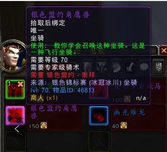 魔兽世界银色角鹰兽是联盟专属坐骑,玩家要达到一定的声望才能购买,购买需要花费的各种物品要通过复杂的收集才能获得,是一个获取难度比较高的坐骑。