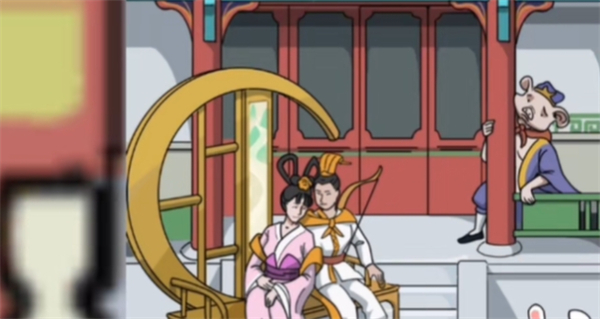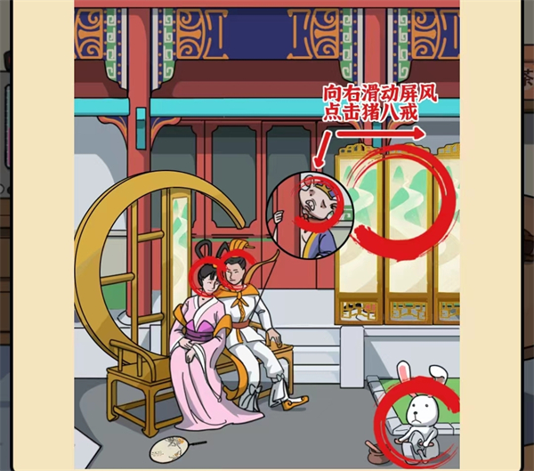5、放大月宫来到第三个场景,点击嫦娥、后羿和玉兔,右滑屏风,点击猪八戒。