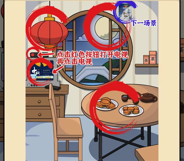 1、点击第一个场景中的月饼、灯笼和窗外的月亮。