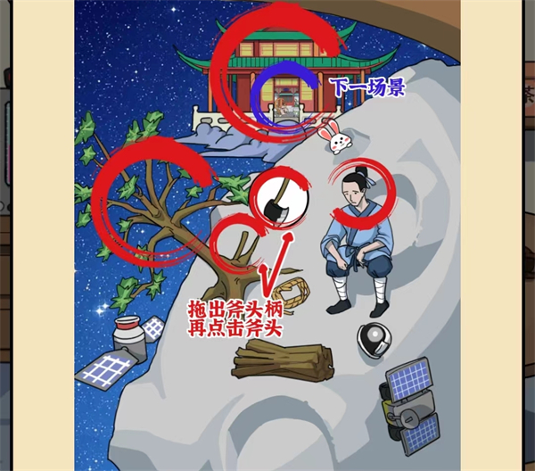 4、点击吴刚、月桂树和月宫,右滑树根处可以找到斧子。