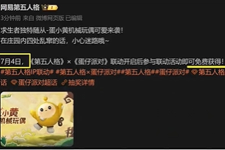 7月4日《第五人格》和《蛋仔派对》即将展开合作,并且会发布新的求生者专属随从——蛋小黄机械玩偶,在游戏中是可以免费获得的,是联动活动的任务奖励。