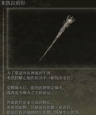艾尔登法环金针是用于治疗的,可以治愈在特定位置的的癫火,还可以给一些NPC使用可以触发支线任务并得到线索,并且使用金针触发的任务奖励会更丰厚,同时难度也会高。