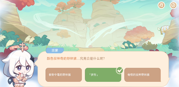 原神颜色很神奇的野林猪是梦形,该问题是海上绮梦录活动中的问题,是需要玩家通过任务给NPC灵感开启梦境,接着在梦境中找到这些问题的答案就可以得到原石作为奖励。