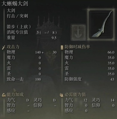 艾尔登法环黄金树幽影大蜥蜴大剑是小恶魔的武器,一把蜥蜴吐舌的大剑使用时会有蜥蜴舌头出现造成攻击小效果,且具有提升韧性的能力而且可以重击可以砍伤。