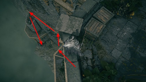 3、玩家从城墙塔赐福点沿着路走,在从附近的平台跳下去达到岩壁再下去。