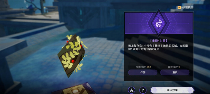 1、选择丰饶命途,第一位面对话结束有概率碰到巡猎的秩序太一的赐福,他会赠送100次作弊次数。