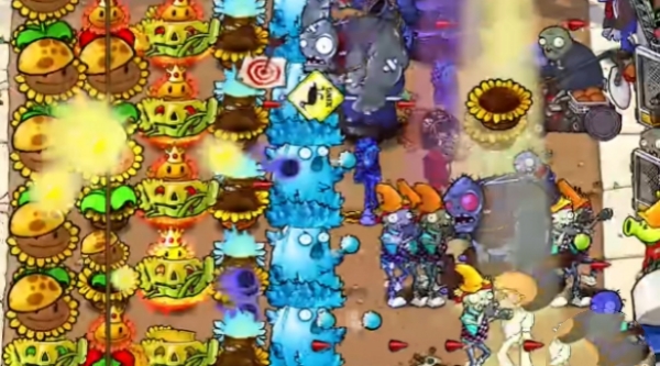 把后面三排都安置好向日葵之后,就可以使用大量的阳光来购买一些高费的植物了。