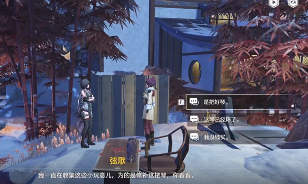 3、在对话中需要做出两个选择,第一次可以随便选,第二次要选择【是把好琴】。