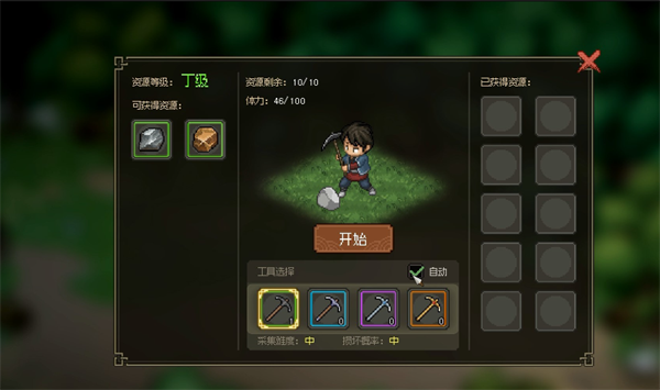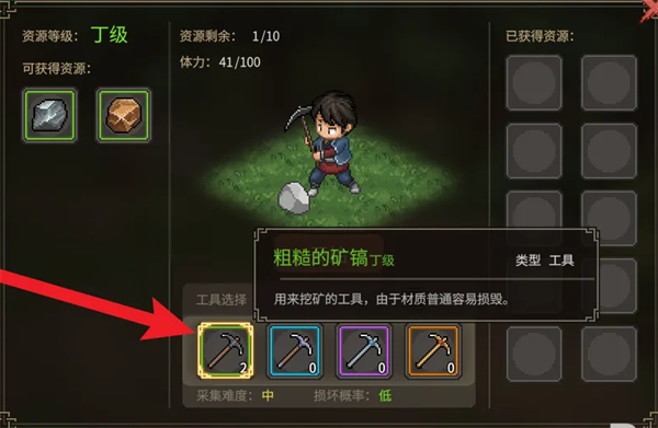 选中中间的开始就能获得铁矿,游戏中的矿镐会在多次使用后自送损坏。