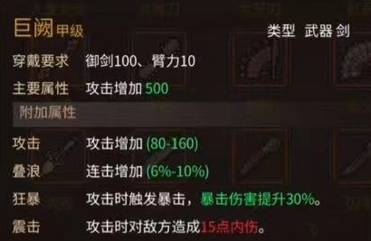 4、他可以对敌人进行侧击跟连击效果,还有沥泉枪、百炼剑、巨厥都较为推荐。