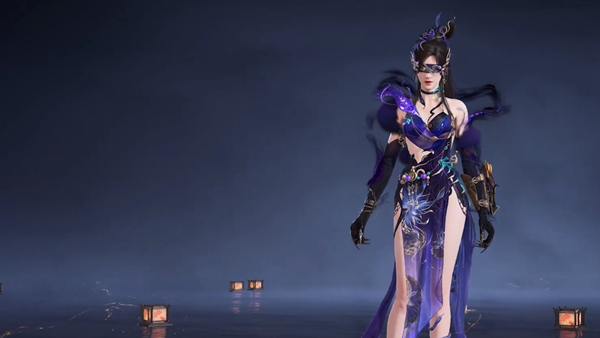 2、紫色的纱裙质地轻盈,如同蝉翼般透明,宛若妖异的蛇骨缠绕全身。